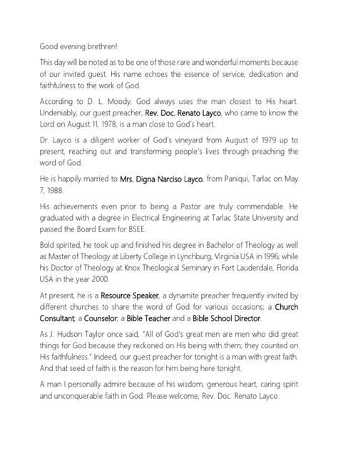 Read Online sample of introduction of a pastor as a guest speaker PDF